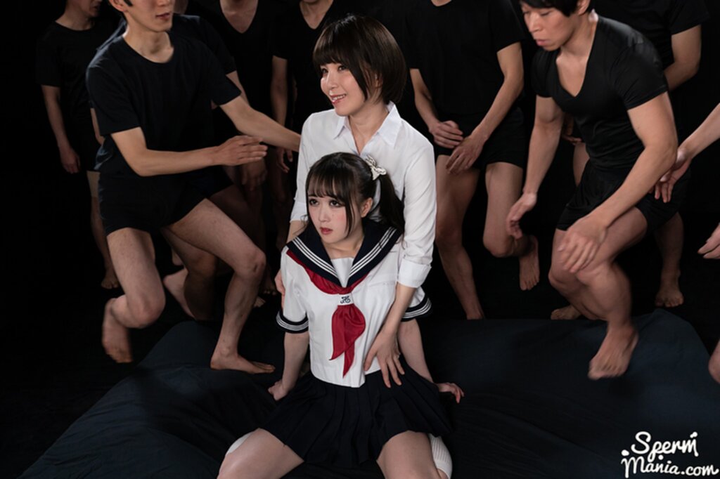 Tutor embracing kneeling kogal in uniform surrounded by men